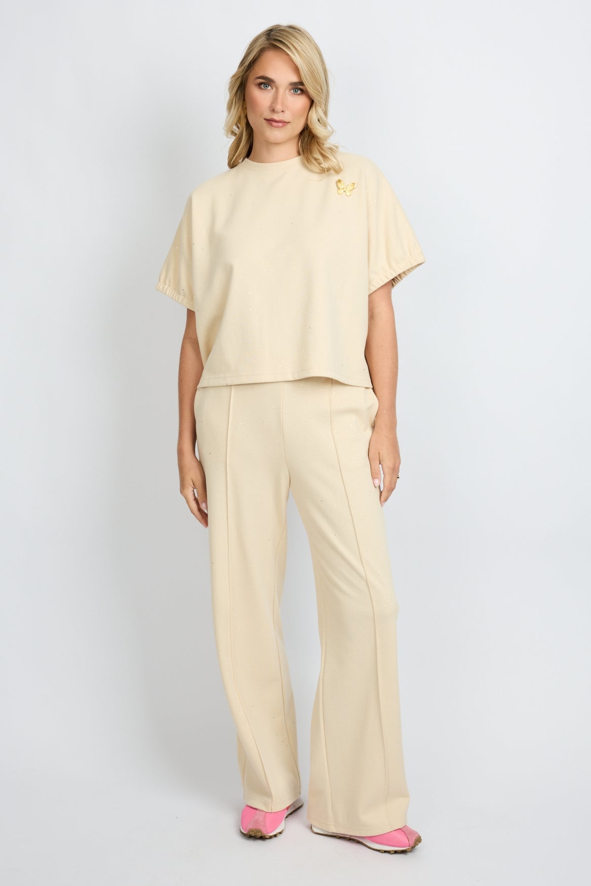 Clean, classy en met een subtiele sparkle. De EWAN BROEK heeft een high waist en recht uitlopende pijpen die zorgen voor een elegante, flatterende fit. De fijne glitter in de stof geeft een zachte glow zonder te overheersen. Dankzij de soepele kwaliteit zit ’ie heerlijk en beweegt hij moeiteloos met je mee. Combineer ’m met de MAVELIS TOP voor een stijlvolle co ord set of draag ’m met een knit voor een meer casual chic look. Effortless elegance, every step of the way.