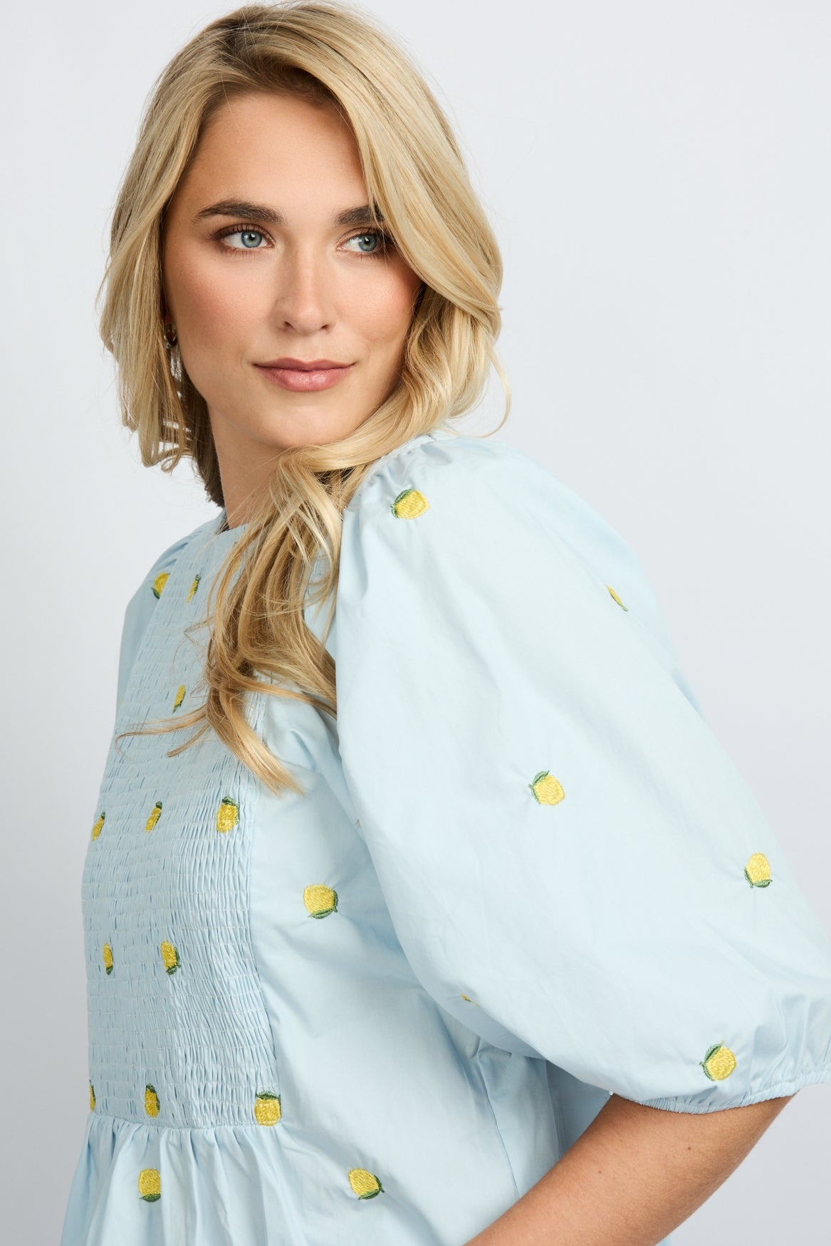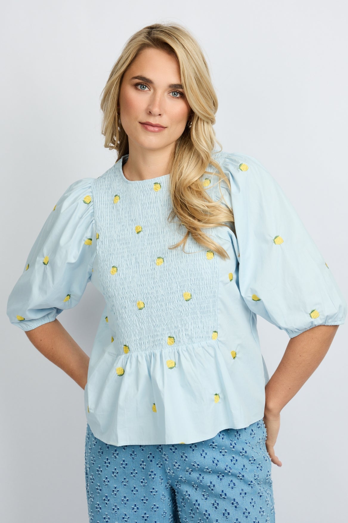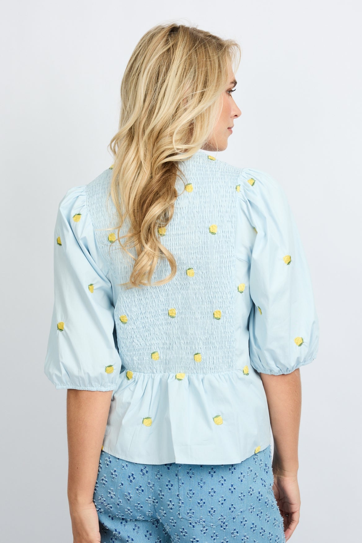 A little lemon love. De SALSITA TOP is een frisse blikvanger met een speelse twist. De gesmokte bovenzijde, pofmouwen en subtiele peplum geven ’m een vrouwelijke en luchtige uitstraling. De geborduurde citroentjes zorgen voor een zomers detail dat direct opvalt. Draag ’m met een kleurrijke pantalon voor een happy vibe of combineer met denim voor een casual chic look. Fresh, fun en full of sunshine.