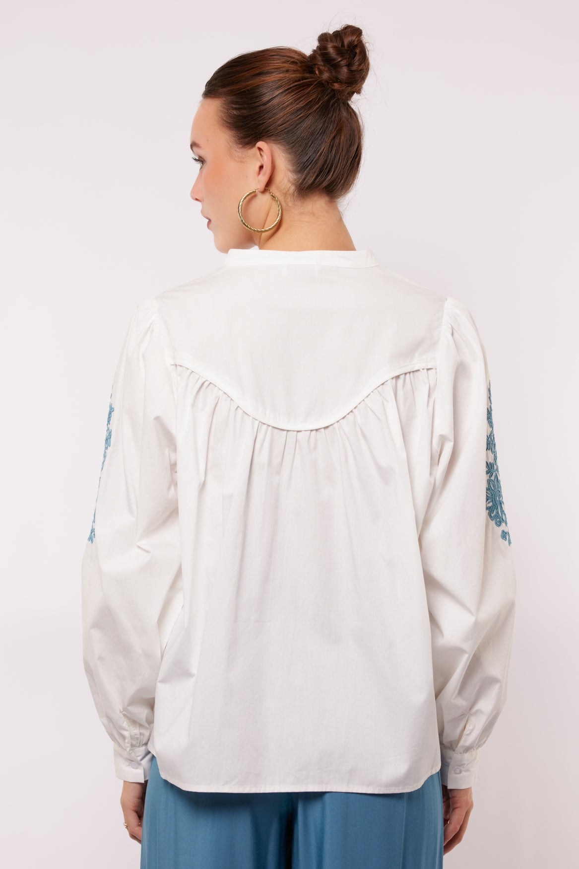 De ELINOR BLOUSE is jouw everyday classic met een twist. De rechte fit, opstaande kraag en geplooide mouwen geven een sophisticated look, terwijl het bloemmotief op de mouw zorgt voor die typische FLURESK fun touch. Combineer met een denim of ga voor chic met een pantalon en hak.