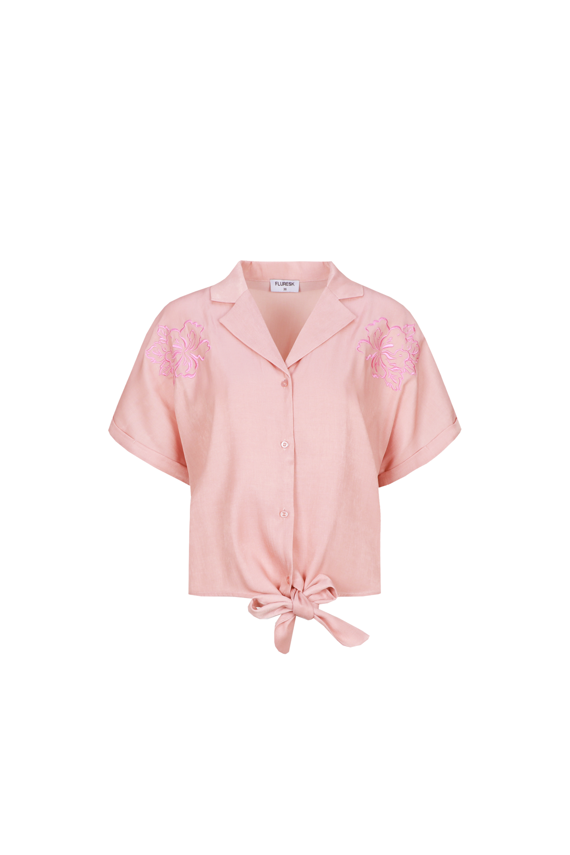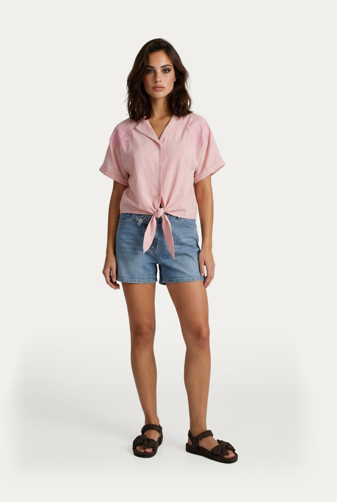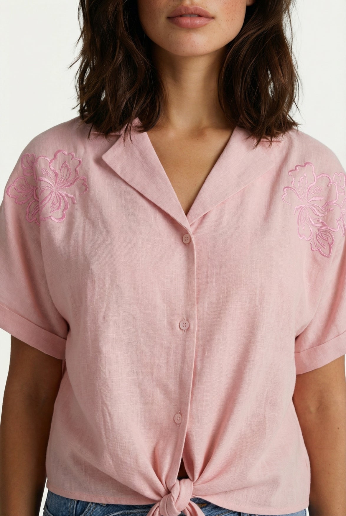 Feminine en effortless. De Evy blouse heeft een luchtige fit en een korte mouw die zorgt voor een relaxte uitstraling. De geborduurde bloemen op de schouders geven een speelse en opvallende touch, terwijl de knoopsluiting en kraag zorgen voor een iets gekledere look. Het strikdetail aan de onderkant maakt de blouse extra vrouwelijk. Perfect te combineren met een short, rok of denim voor een easy, zomerse outfit.