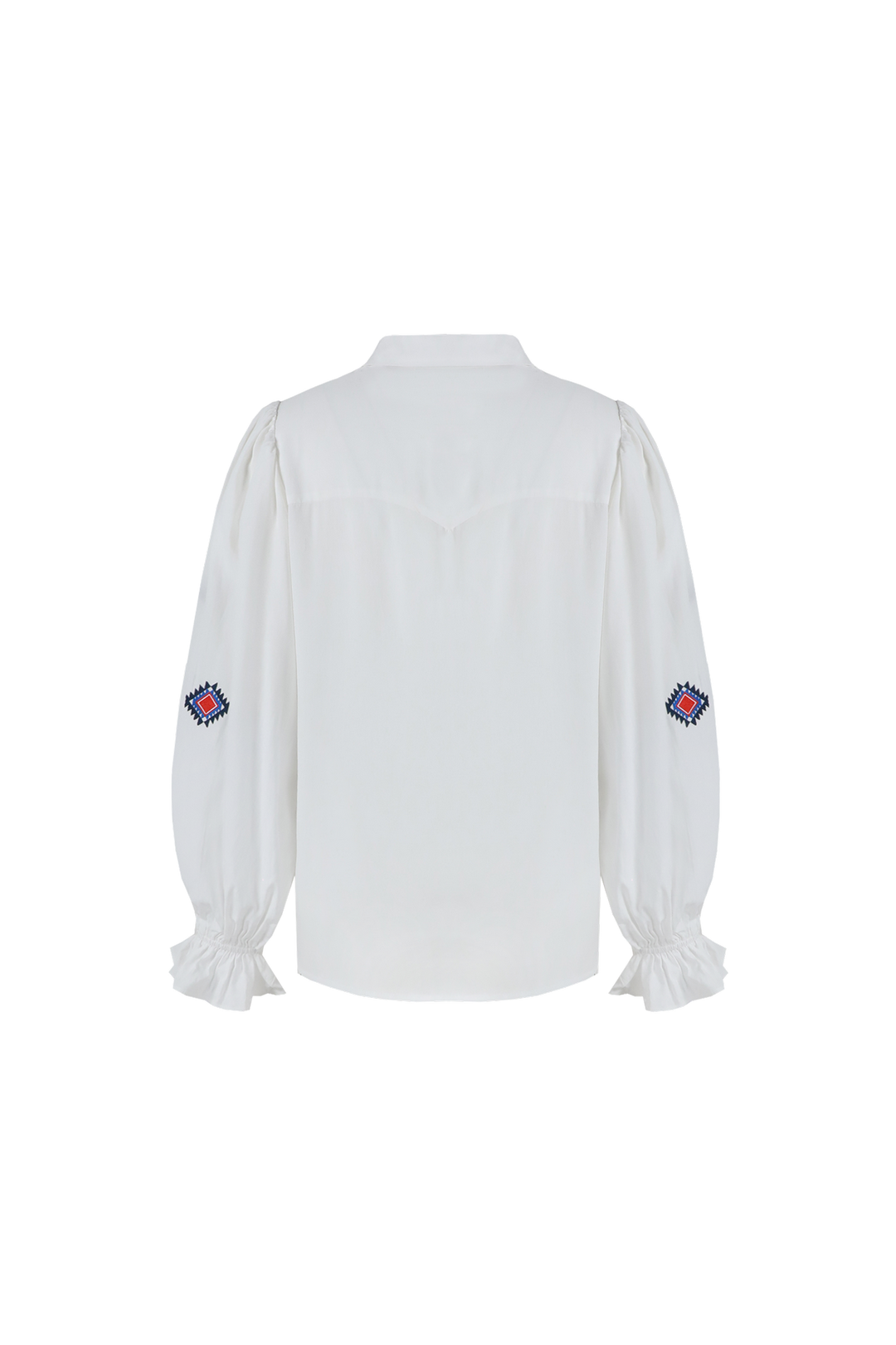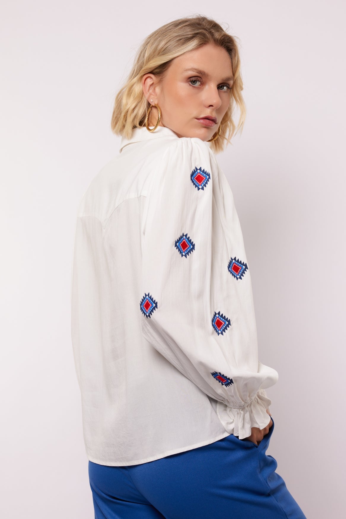 Boho details, maar dan bold! De FAYRA BLOUSE is beschikbaar in zwart met roze borduurwerk of wit met blauwe accenten. De geborduurde mouwen en sierlijke manchetten geven deze blouse een vrouwelijke feel met karakter. Draag ‘m op een straight leg jeans of een rok voor een speels silhouet — welke kleur kies jij?