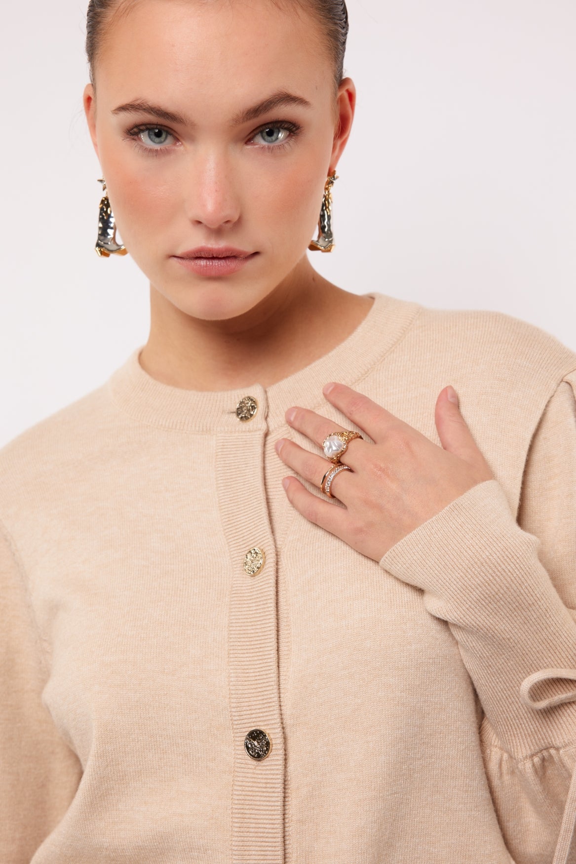 De VAYDA VEST is je nieuwe go-to knit. De pofmouw, grove boorden en sierkoordjes aan de mouwen geven ‘m een opvallende look, terwijl de knoopsluiting met glinsterknopen zorgt voor een beetje sparkle. Draag ‘m open met een tanktop eronder of gesloten als top. Verkrijgbaar in meerdere kleuren, kies jouw vibe!